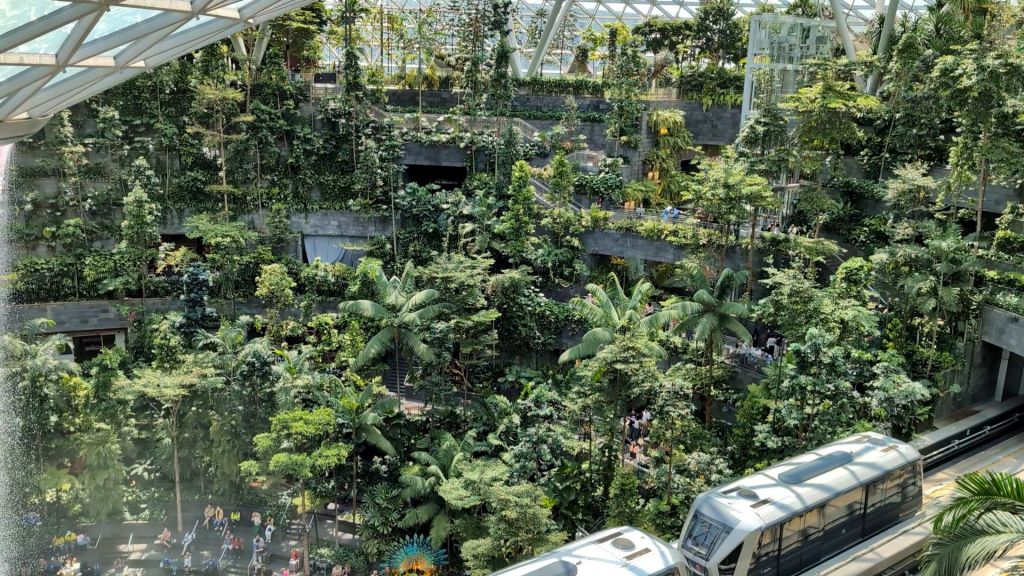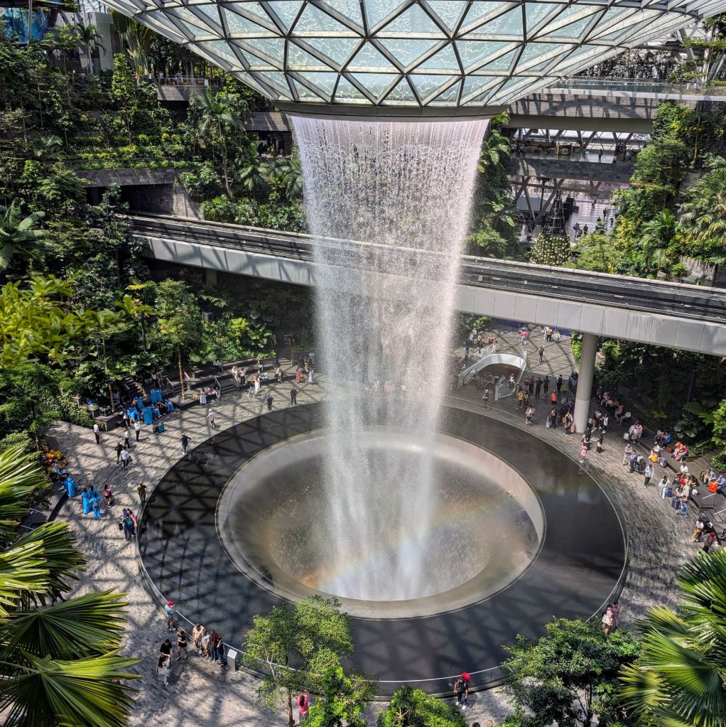 - Jewel Changi Airport (Terminal 2): La joya del aeropuerto es este impresionante complejo de entretenimiento y compras. Destaca por la Rain Vortex, la cascada interior más alta del mundo. Tiendas, restaurantes y jardines temáticos que lo convierten en un destino único.